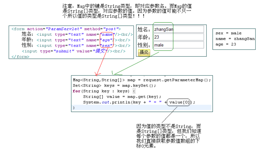 request.getParameterMap()方法返回Map类型,对应所有参数,其中Map的key对应参数的名字;Map的value对应参数的值