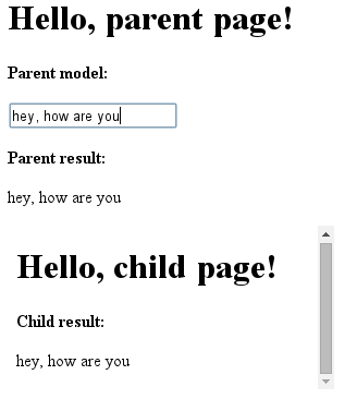 The important part is $scope.data = $window.parent.DataService.getScope(); in the child controller. That's where it fetches the shared $scope.