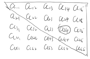 我们可以这样考虑:对于一个上三角块里第i行第j列的元素,它在数组里的下标就等于(在原矩阵中)他前面i-1行的元素数量 + (原矩阵中)他所在行的他前面的元素数量,以下面这个矩阵为例,