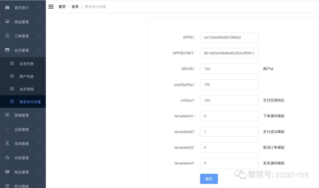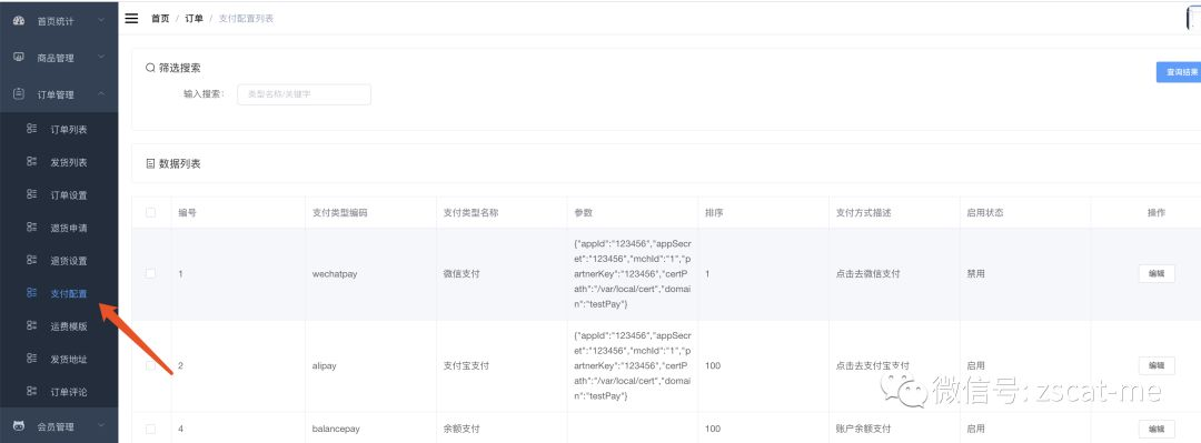 支付相关的配置,需要有商户号,然后填写到系统,打开订单管理-支付配置