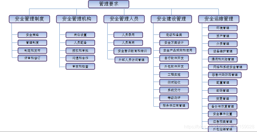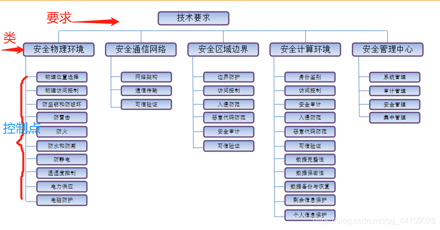 等级保护要求中的建设整改内容列出了等保中的所有的要求项,那整改什么了?整改内容可以分为两大要求:技术要求和管理要求。这两大要求又分别有五大类。每个类下面又包含很多控制点,控制点下面有很多要求项(要求项就是具体告诉你怎么做才合格,下图中没有列出来)