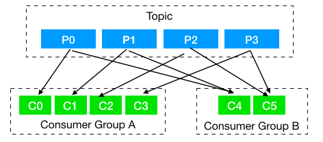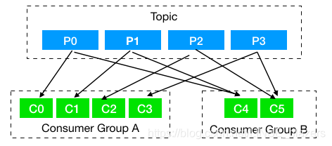 如上图所示,某个主题共有4个分区(Partition):P0、P1、P2、P3。有两个消费组A和B都订阅了这个主题,消费组A中有4个消费者(C0、C1、C2、C3),消费组B中有2个消费者(C4和C5)。按照Kafka默认的规则,最后的分配结果是消费组A中的每一个消费者分配到1个分区,消费组B中的每一个消费者分配到2个分区,两个消费组之间互不影响。每个消费者只能消费所分配到的分区中的消息。换言之,每一个分区只能被一个消费组中的一个消费者所消费。
