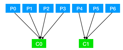 此时消费组内又加入了一个新的消费者C1,按照既定的逻辑,需要将原来消费者C0的部分分区分配给消费者C1消费,如下图:消费者C0和C1各自负责消费的分区无逻辑上的干扰。