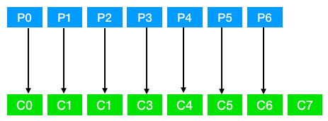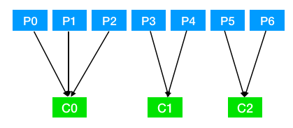 紧接着消费组内又加入了一个新的消费者C2,消费者C0、C1、C2按照下图的方式各自负责消费所分配到的分区: