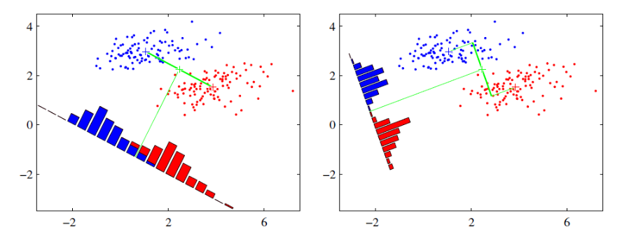从上图直观看出,右图红色数据和蓝色数据在各自的区域来说相对集中,根据数据分布直方图也可看出,所以右图的投影效果好于左图,左图中间直方图部分有明显交集。