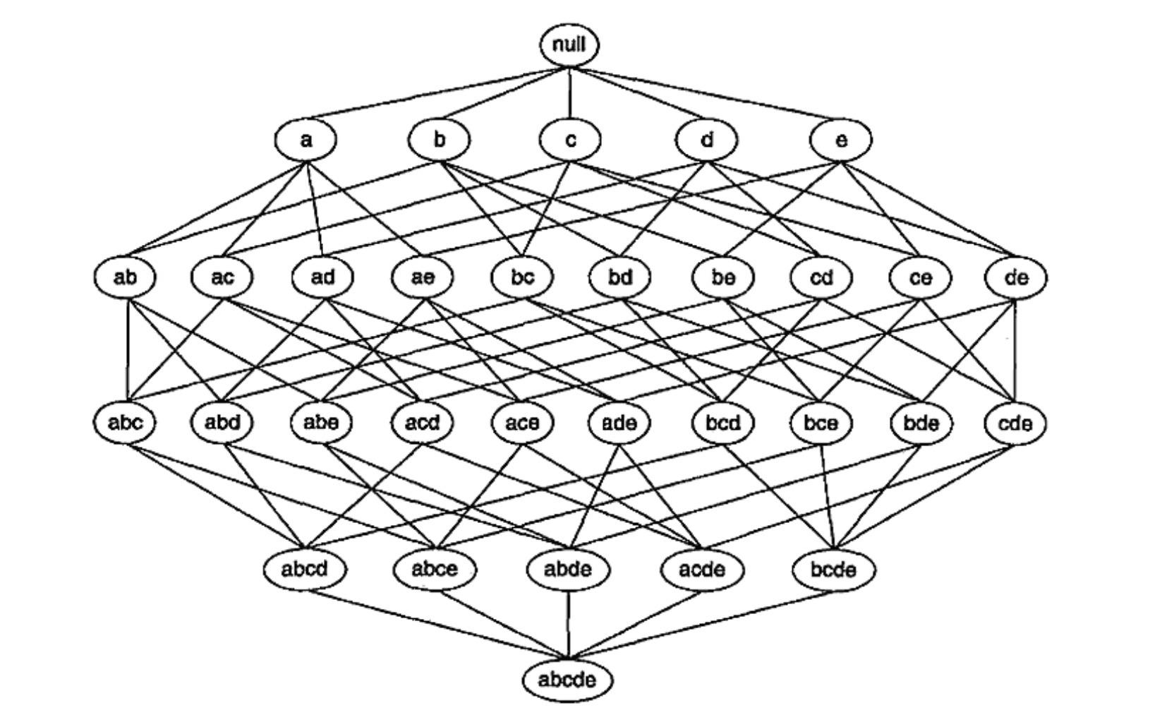 一般包含个项的数据集可能产生个频繁项集(不包括空集)。当足够大时,需要搜索的项集空间是指数规模的。下图展示了的项集格结构lattice structure。