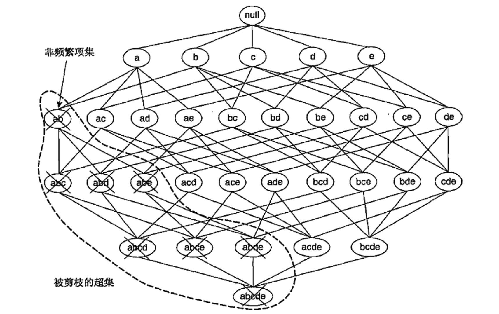 先验原理:如果一个项集是频繁的,则它的所有子集都是频繁的;如果一个项集是非频繁的,则它的所有超集也一定是非频繁的。
