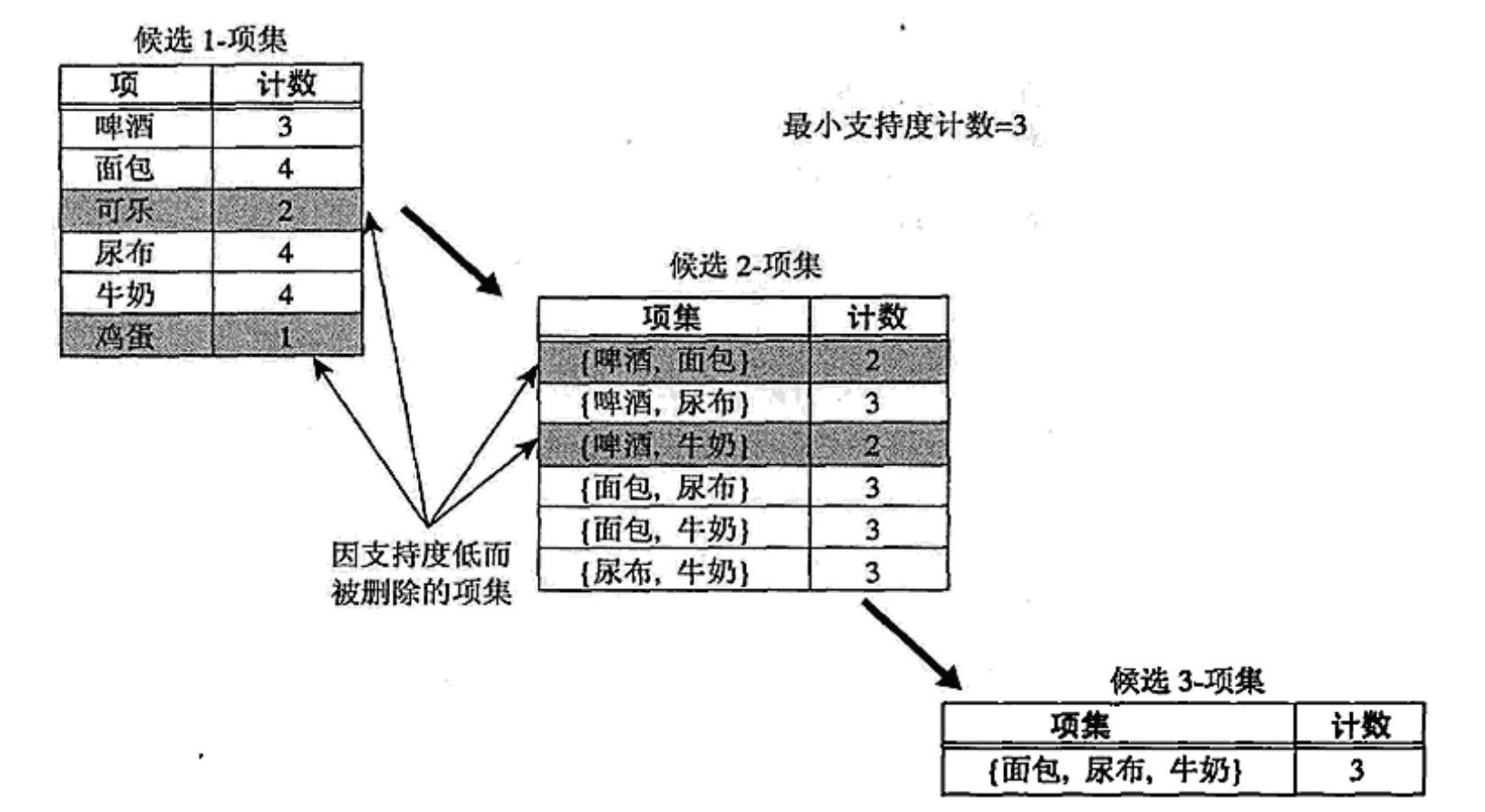 - 确定候选项的支持度计数,删去支持度计数小于