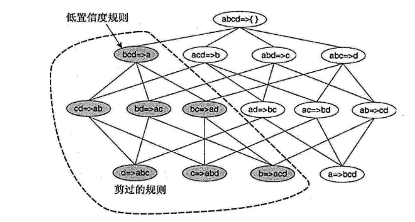 定理:如果不满足置信度阈值,则形如的规则也一定不满足置信度阈值,其中是的子集。