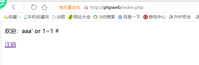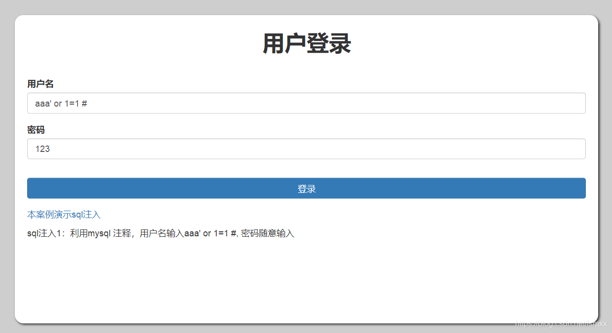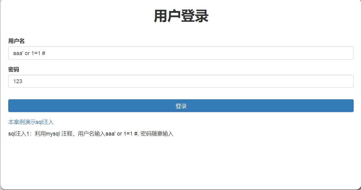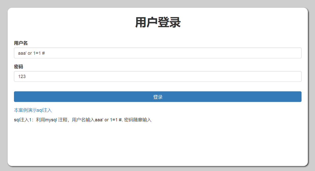 <p>sql注入1:利用mysql 注释,用户名输入aaa' or 1=1 #, 密码随意输入</p>