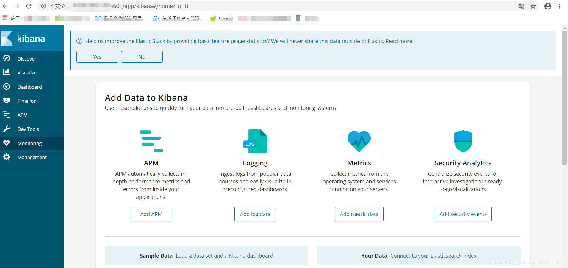 启动kibana ../bin/kibana (好不容易截图成功了==之前老进不去 因为内存太小,ES跑挂了。重启后马上刷新kibana.后面服务器换了公司的测试服务器。因为配置稍微好一些。而且公司刚好也需要搭ELK)