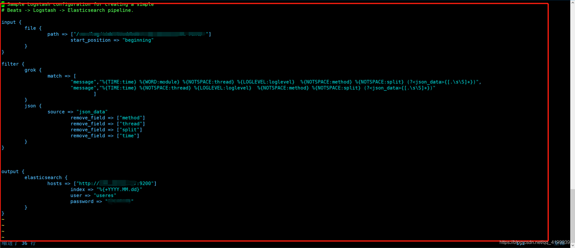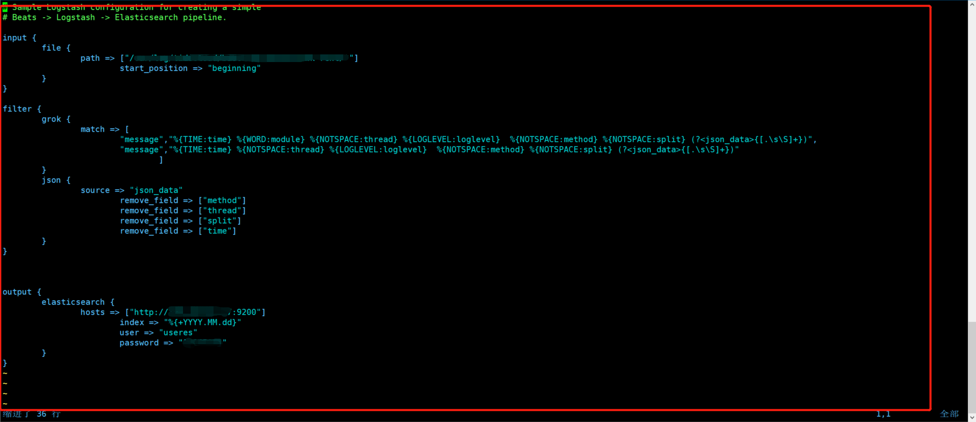 这段内容是百度后修改的==主要内容为输入输出 output 以及过滤器 input表示数据源 path是一个数组,定义需要同步的内容 这里是同步日志文件。最好用绝对路径 输入日志的路径(支持通配符)。output输出位置。这里定义的是输出到es 配置es地址 index 是es索引库最好根据项目名+日期来建 。user是具有es权限的用户 。即启动ES时 新增的USER password 是user的password.(中间的过滤器脚本我也不太熟,就直接加上了)
