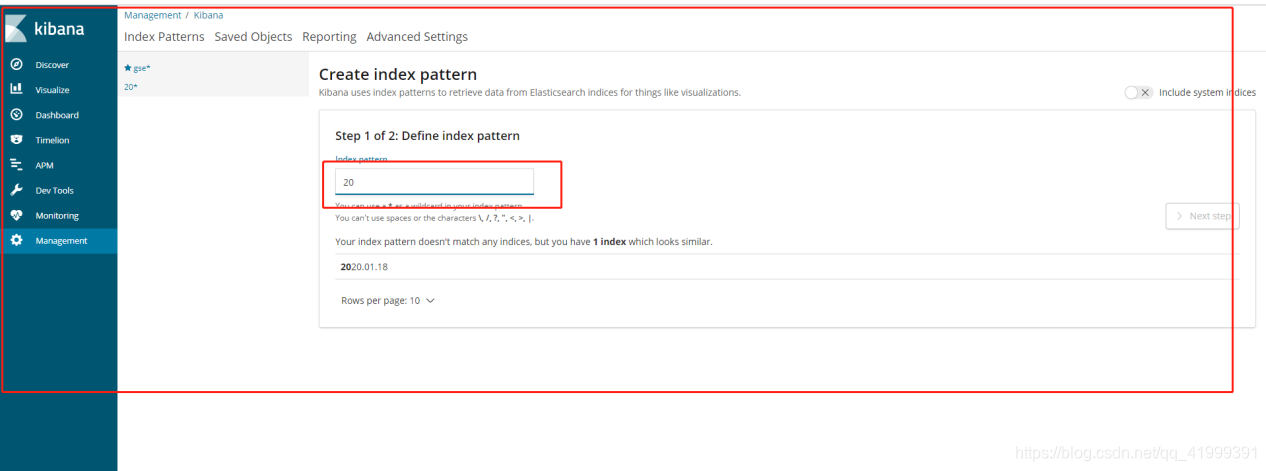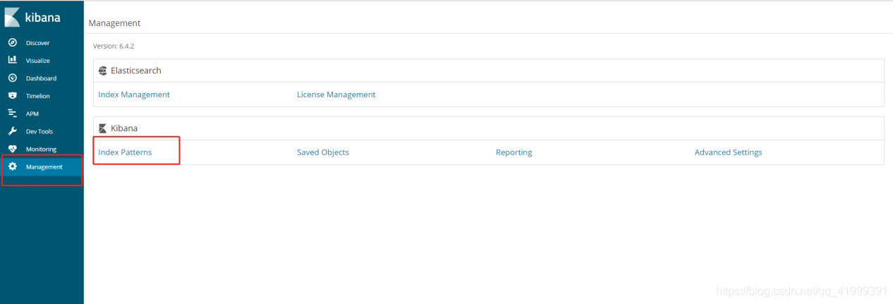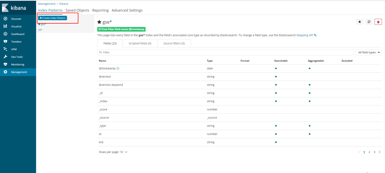 点击如图所示Management->index Patterns-->Create Index Pattern