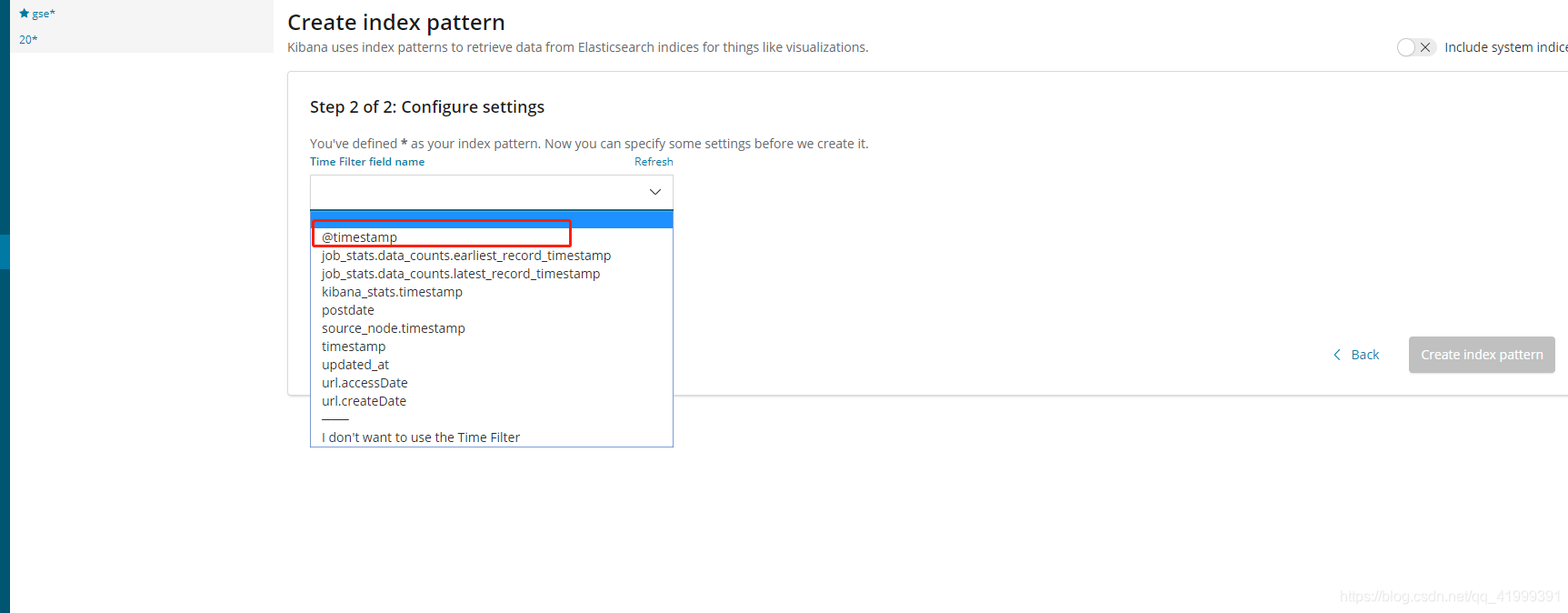 输入新建的索引名 下一步 选择@Timestamp ->create Index Pattern 就可以在kibana上查询日志文件了。