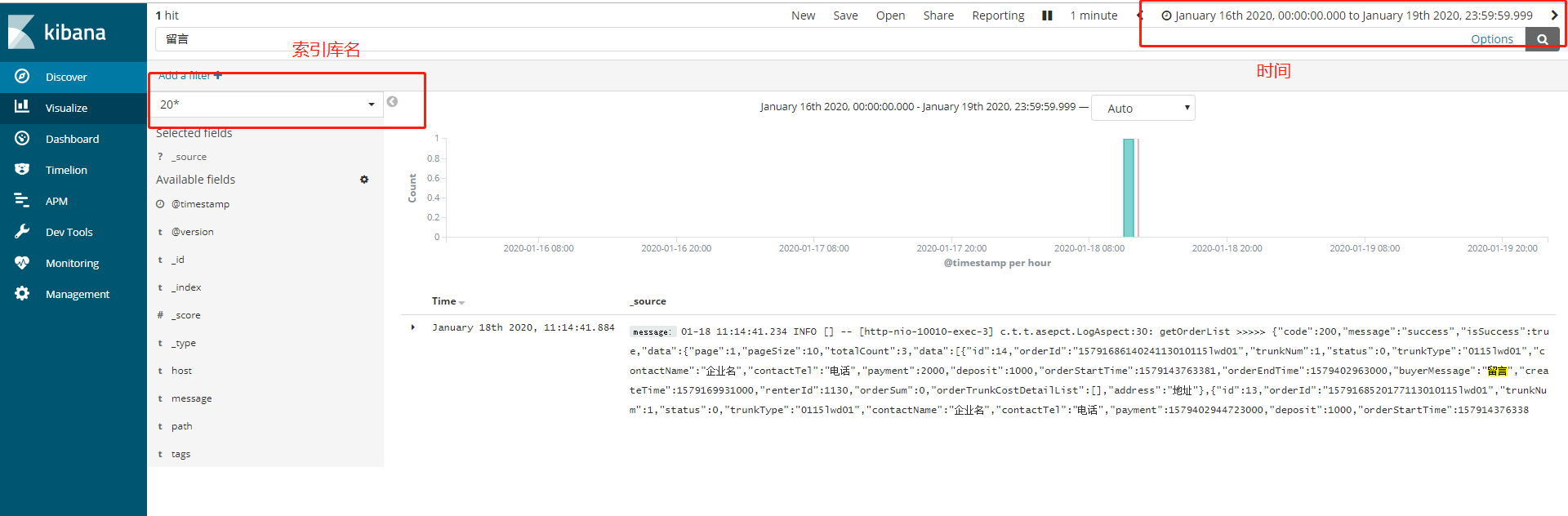 设置日志产生时间 以及索引库 加要搜索的关键词 如 “留言” 开始搜索 即能查询到结果