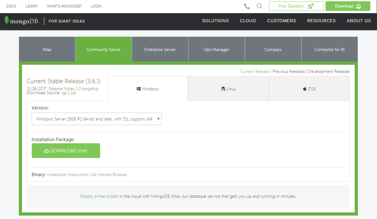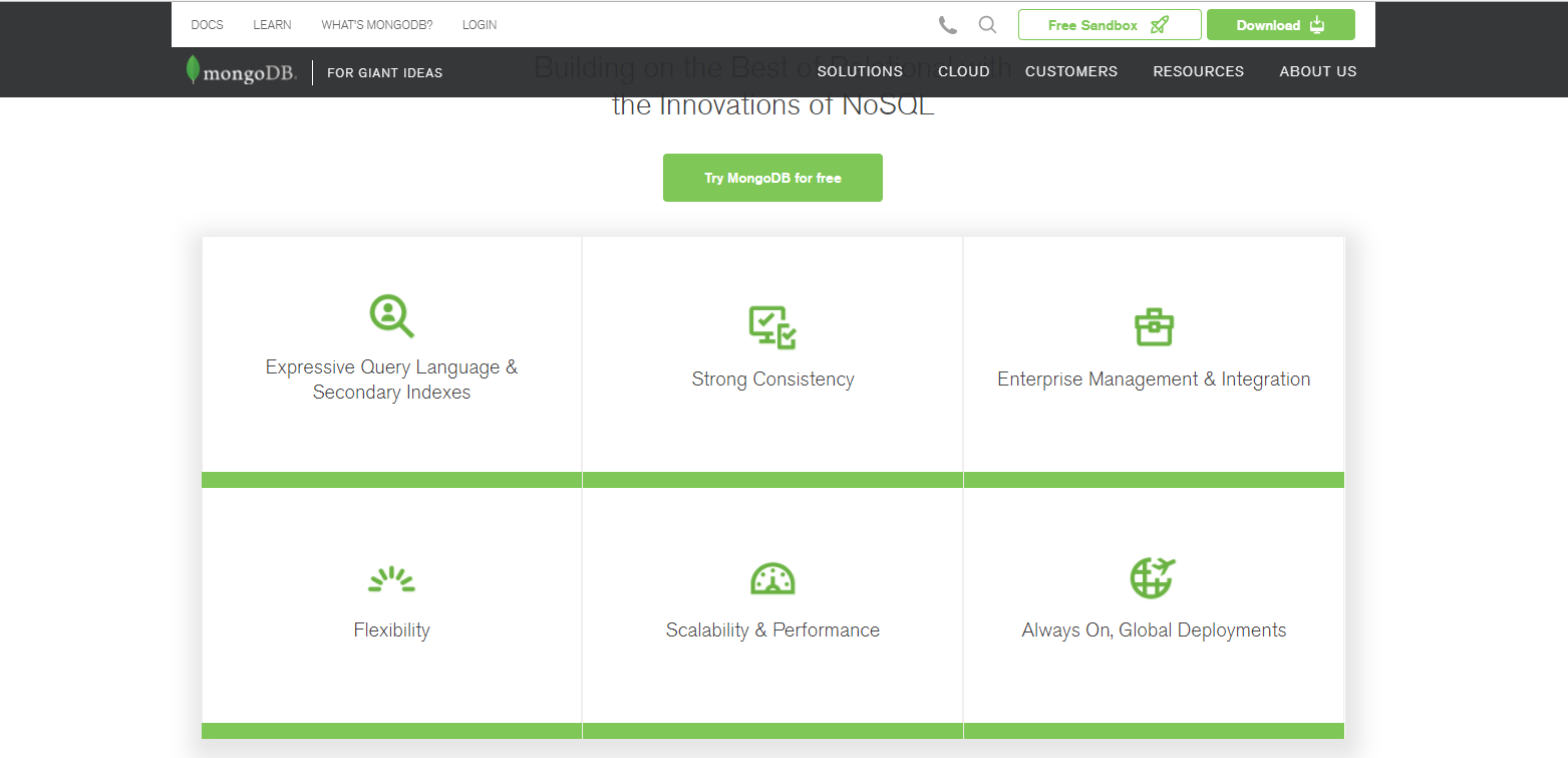 下载文件:首先在mongodb的官方网站上下载最新版本的mongodb安装程序,https://www.mongodb.com/,滚动网页至Try MongoDB for free