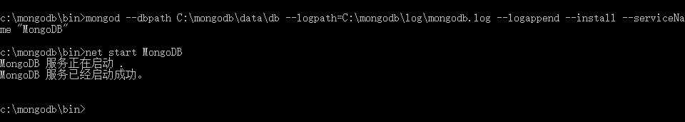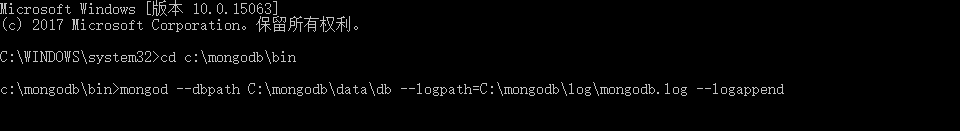 mongod --dbpath C:\mongodb\data\db --logpath=C:\mongodb\log\mongodb.log --logappend