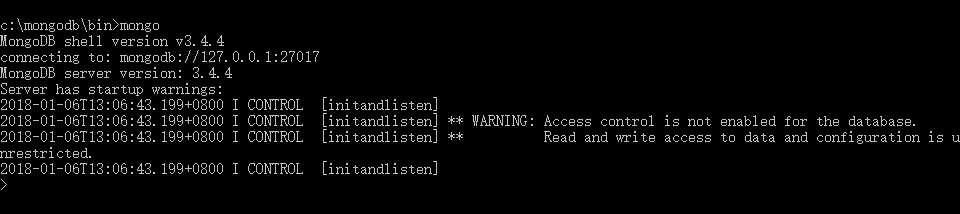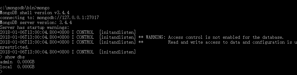 连接:使用cmd命令窗口,并进入至c:\mongodb\bin目录,运行命令