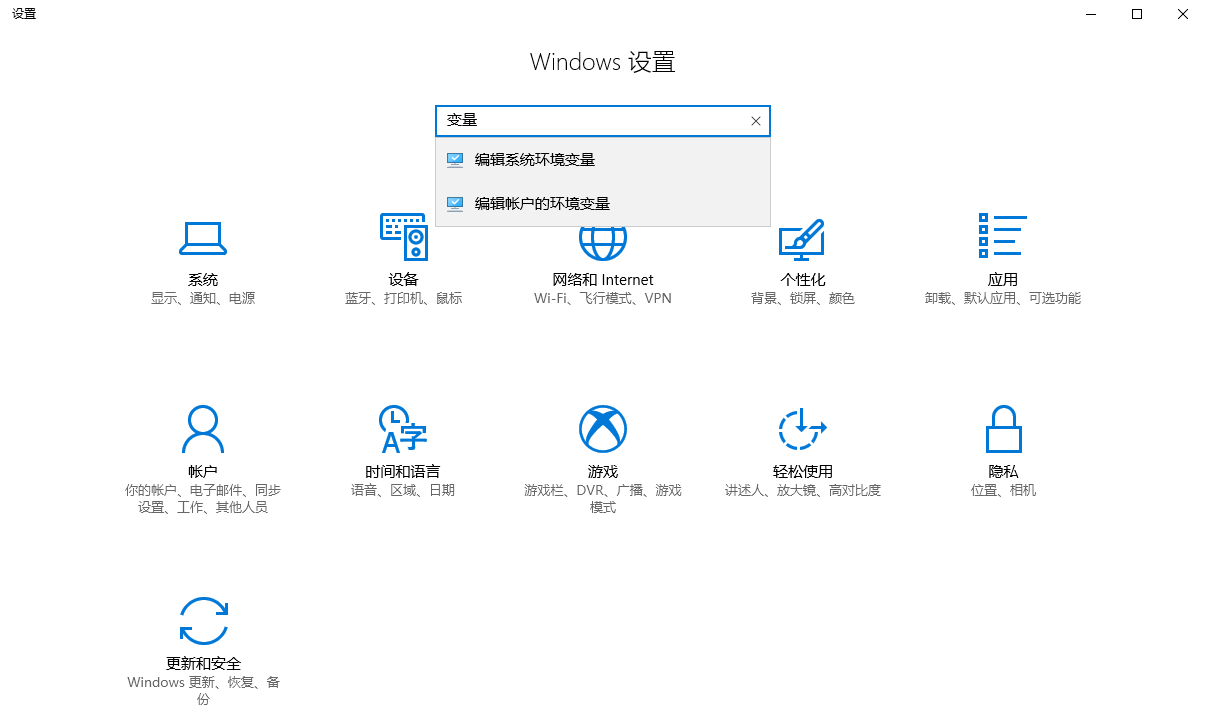 打开windows的设置窗口,输入变量即可,点击“编辑系统环境变量”