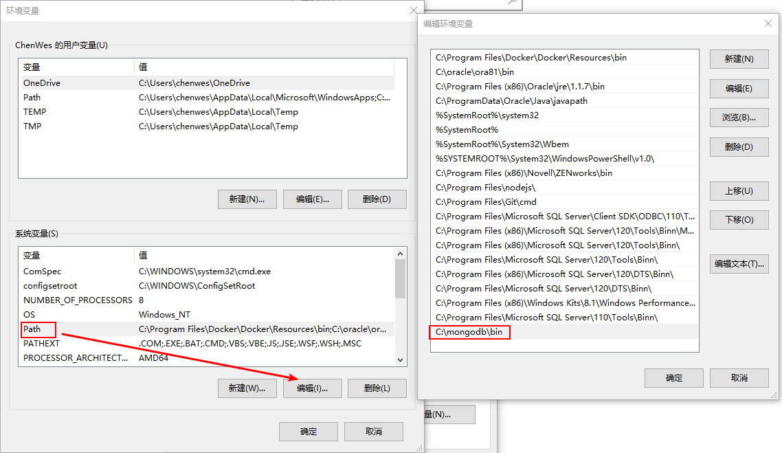 将mongodb的bin目录加入至path环境变量中