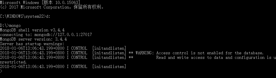 启动服务器:在Win10中以管理员身份运行cmd命令窗口,并进入至c:\mongodb\bin目录,运行命令,即已经运行了mongodb的服务器了,正常的话应该有一行文字表明已经正常启动服务器的,可我的电脑没有,不知道是什么原因