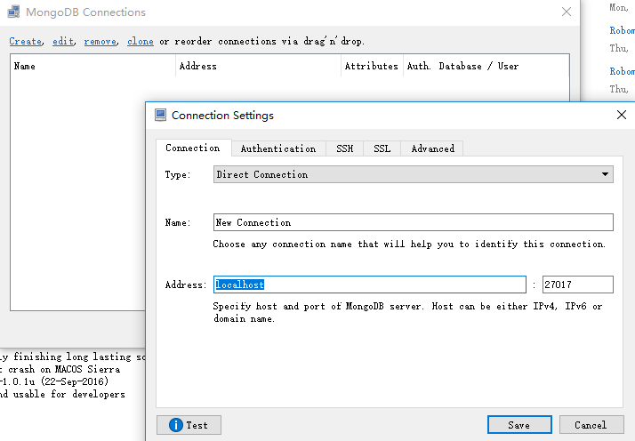 点击create,输入mongodb的地址及端口,我们连接本机的27017