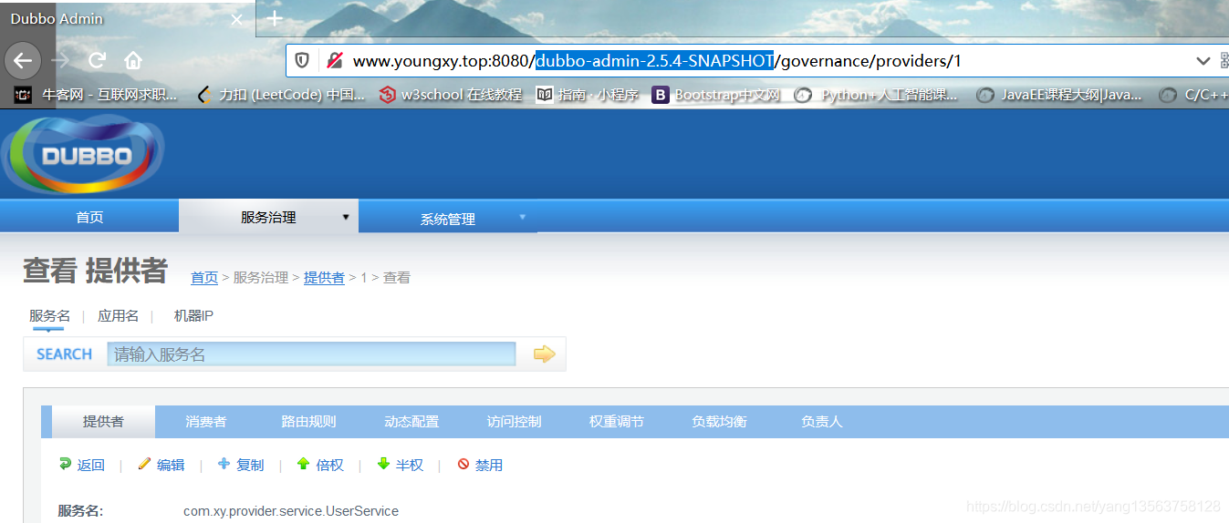 ip:8080/dubbo-admin-2.5.4-SNAPSHOT #这里的ip如果是本机:localhost 后面dubbo-admin-2.5.4-SNAPSHOT为webapps下的dubbo的文件名