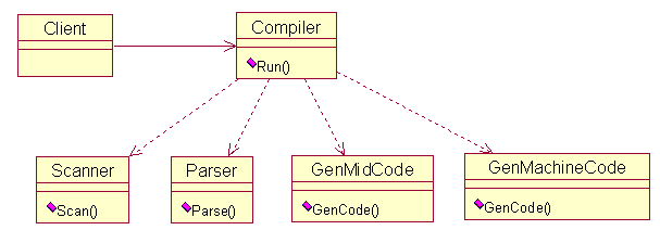 举个编译器的例子,假设编译一个程序需要经过四个步骤:词法分析、语法分析、中间代码生成、机器码生成。学过编译都知道,每一步都很复杂。对于编译器这个系统,就可以使用外观模式。可以定义一个高层接口,比如名为Compiler的类,里面有一个名为Run的函数。客户只需调用这个函数就可以编译程序,至于Run函数内部的具体操作,客户无需知道。下面给出UML图,以编译器为实例。