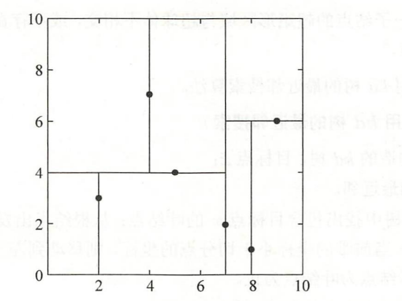 kd树即在n维空间(坐标为n维时),以垂直于坐标轴的方法进行空间切分。且切分位置为其坐标的中位数,如下图所示: