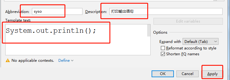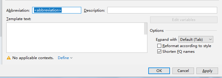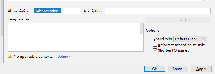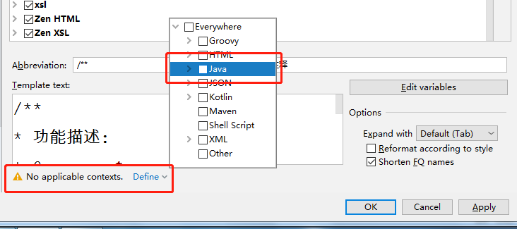 2. 同时要定义模板文件要应用在哪个语言上,就是上图中的No application context这里,点击,Define,选择java即可。