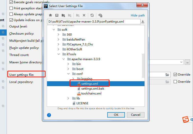 然后,配置settings.xml配置文件,点击User settings file后面的省略号,选中本地maven下conf下的settings.xml,如图: