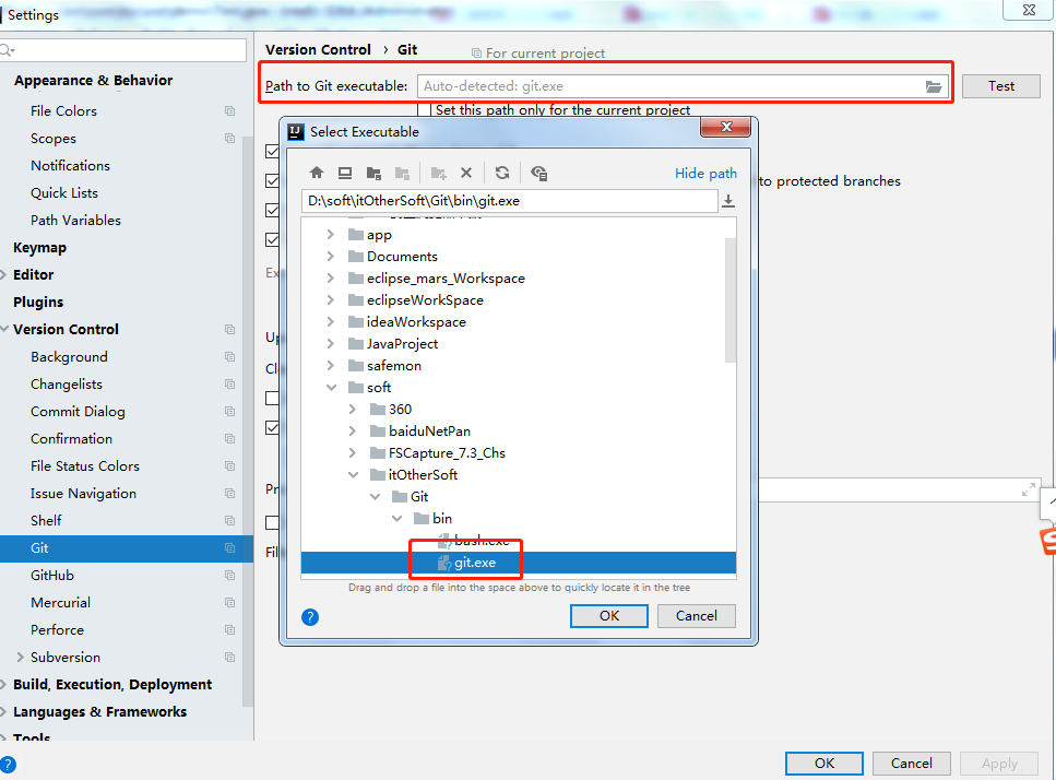 点击,右侧的Path to Git execulate,选择git.exe,如图: