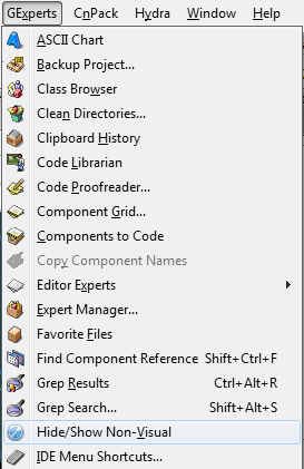 This option is included inside of the Gexperts menu and is called Hide/Show Non-Visual.