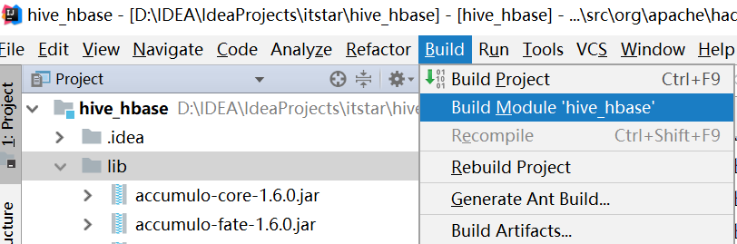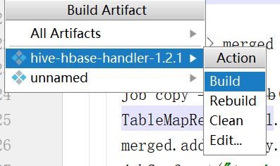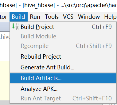 10. 点击Build选项中的【Build Artifacts】。在【Build Artifacts】中选择要你刚才生成的Artifact。也就是【hive-hbase-handler-1.2.1】。点击【Build】