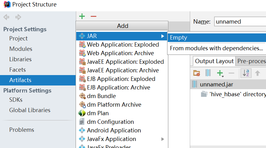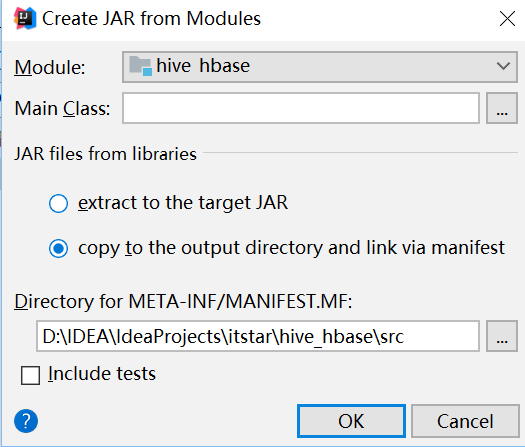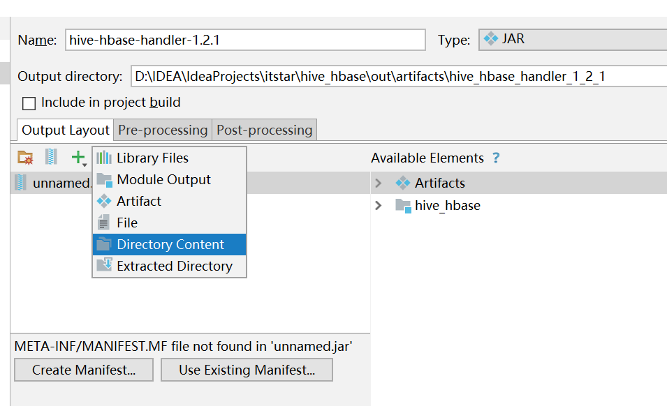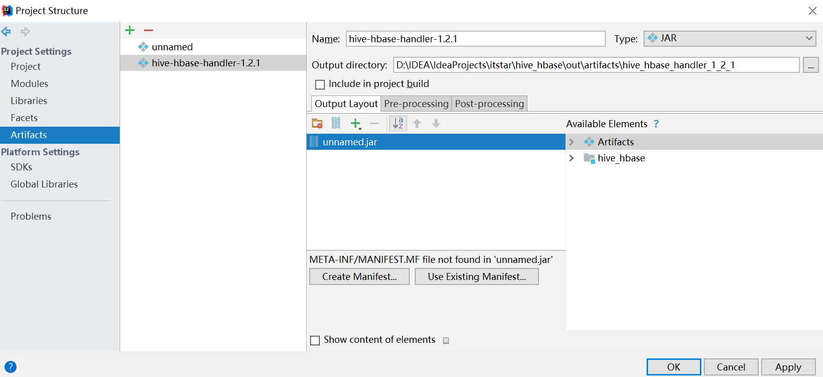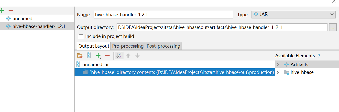 这里面的【Name】和【Output directory】可以自己指定。【Output directory】就是生成的jar存放的地址。【Name】就是jar名字,可以指定为【hive-hbase-handler-1.2.1】。