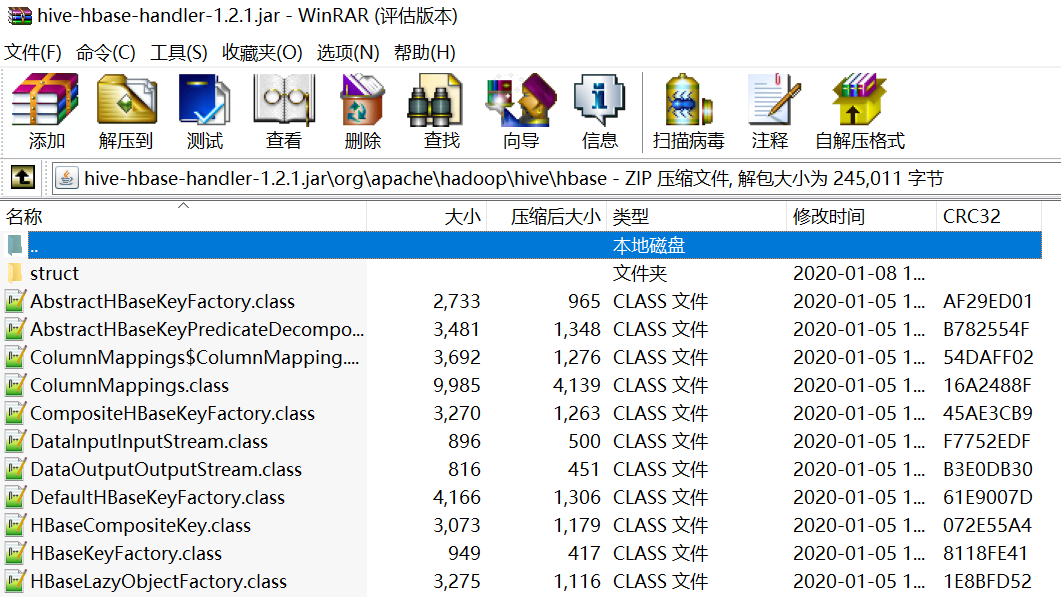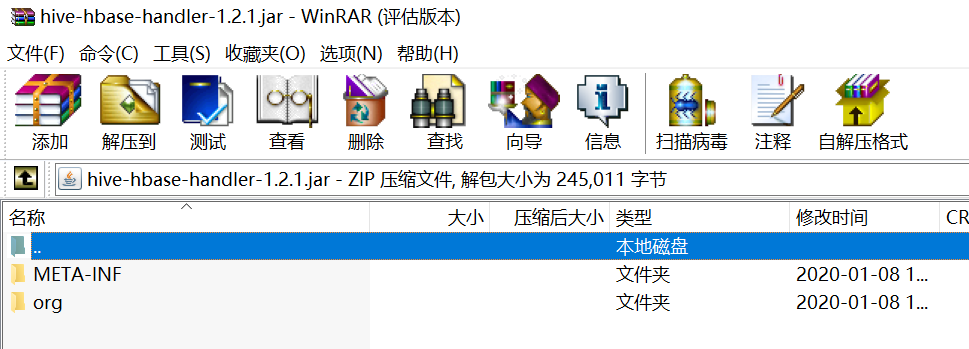 12. 打开jar,更名为【hive-hbase-handler-1.2.1.jar】,查看其中结构 。【最后编译号的jar中包含了META-INF文件夹和org文件夹,而且是class文件】