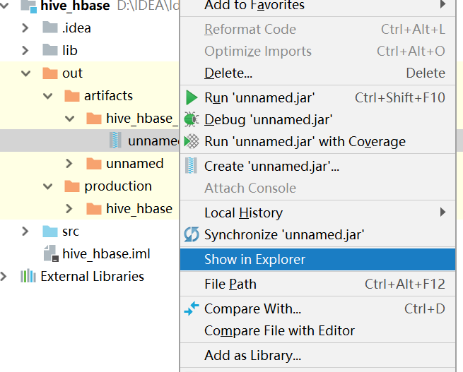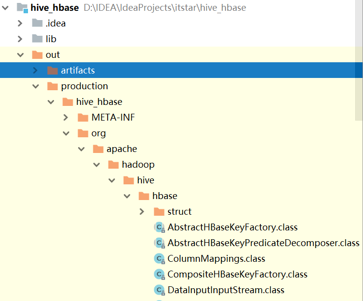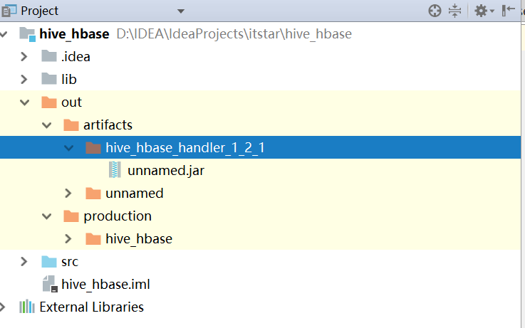 11. 在项目的【out】文件夹内就出现了【artifiacts/hive-hbase-handler-1.2.1】,在这里能找到我们已经编译的jar。在文件夹中找到这个jar。
