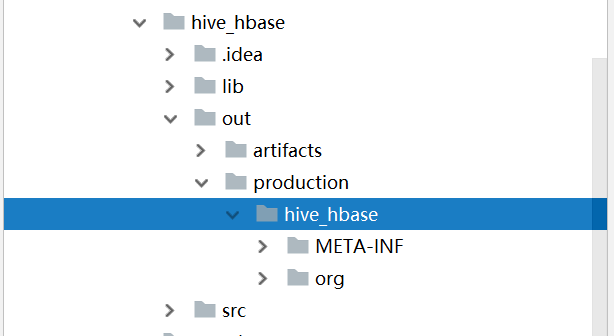 然后在选择编译后的class文件所在的目录,注意:【最后编译号的jar中要包含META-INF文件夹和org文件夹,所以选择他们上一层的文件夹,也就是hive_hbase/out/production/hive_hbase】