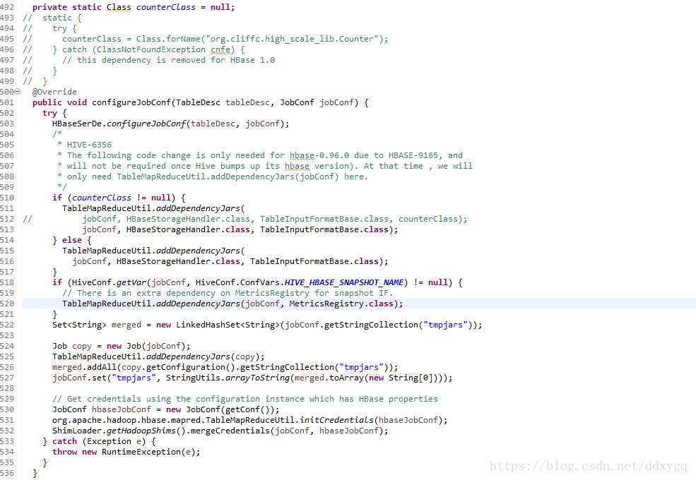 7. 修改【hive_hbase/org/apache/hadoop/hive/hbase/HBaseStorageHandler.java】的492行代码,改成如下: