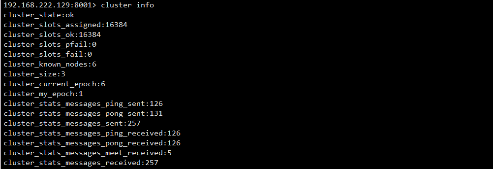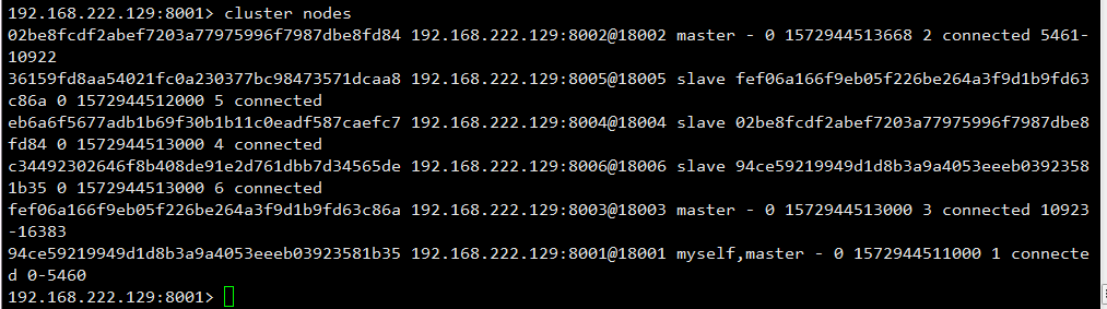 redis-cli --cluster create 192.168.222.129:8001 192.168.222.129:8002 192.168.222.129:8003 192.168.222.129:8004 192.168.222.129:8005 192.168.222.129:8006 --cluster-replicas 1