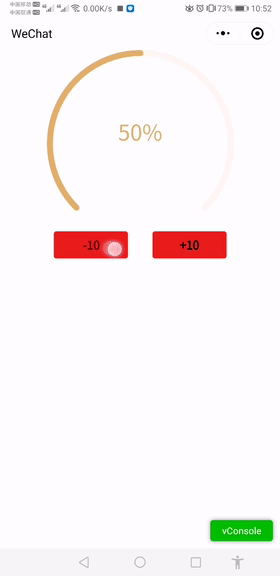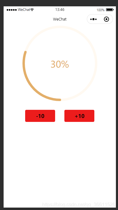 我这里设置了组件宽度为500rpx,进度框弧度大小为3/4个圆的大小,其他属性都用默认的并加了两个按钮加进度和减进度。