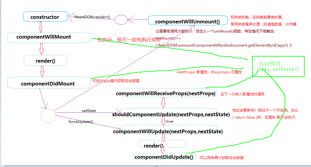 1. componentWillMount: 先执行,但不一定先执行完毕(比如遇到异步函数)
