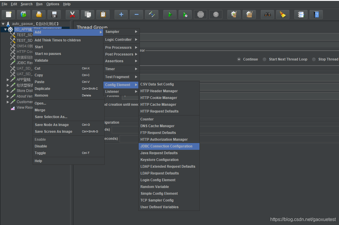 5.创建JDBC Connection Configuration:右击【Thread Group(线程组)】选择【Add】—【Config Element(配置元件)】—【JDBC Connection Configuration】