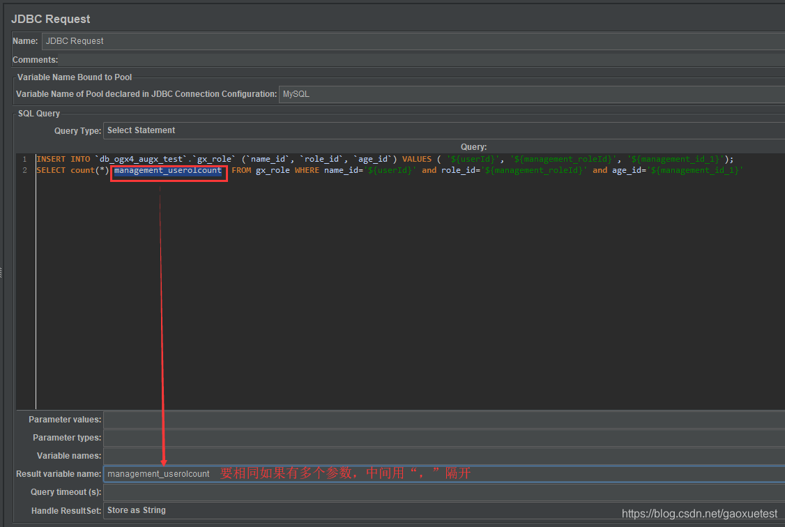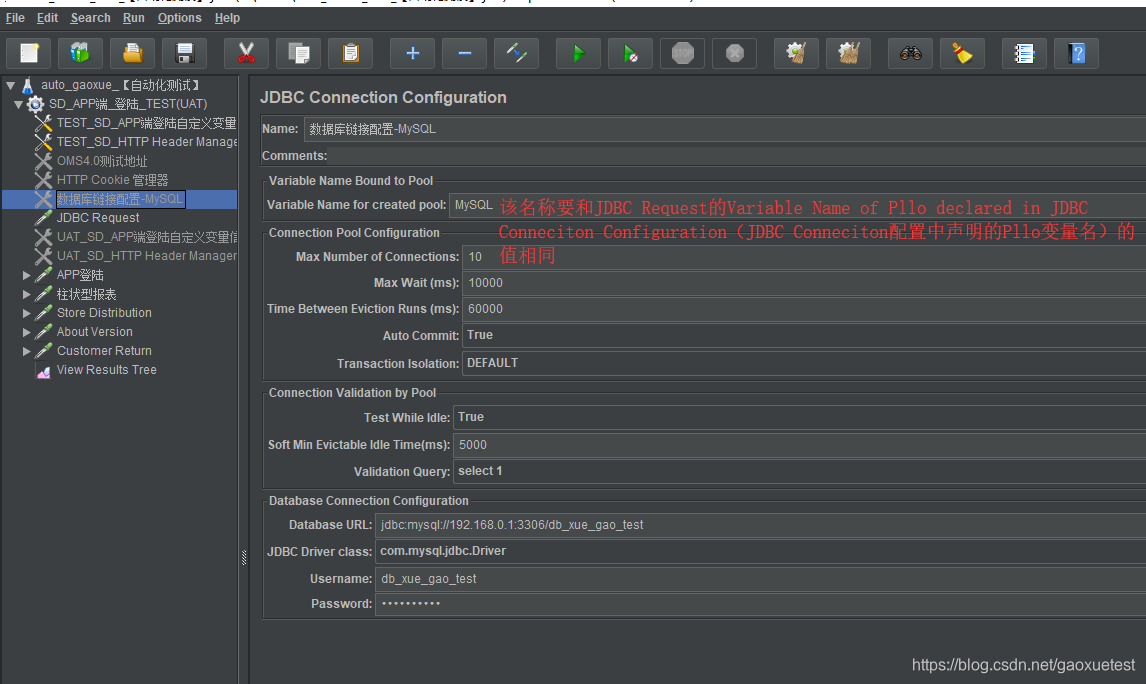 原因:因为链接数据库是需要在JDBC Connection Configuration中配置好的,然后赋予一个变量名称,那么JDBC Request想要去访问数据库,就必须通过这个配置好的元件去链接,所以JDBC Reques就需要通过读取JDBC Connection Configuration的变量中的信息,那怎么读取呢,JDBC Reques就需要用到这个变量了,就需要到名称为mysql的元件中去应用。