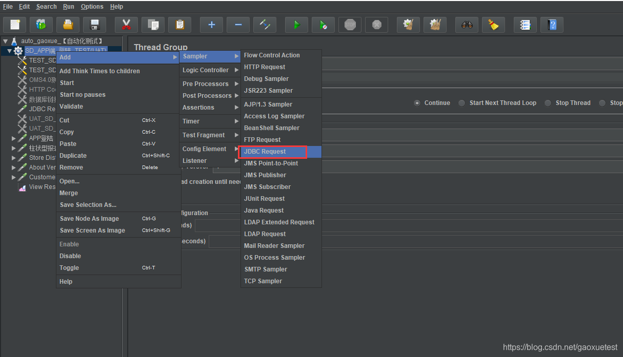 5.创建JDBC Request:右击【Thread Group(线程组)】选择【Add】—【Sampler(取样器)】—【JDBC Request】