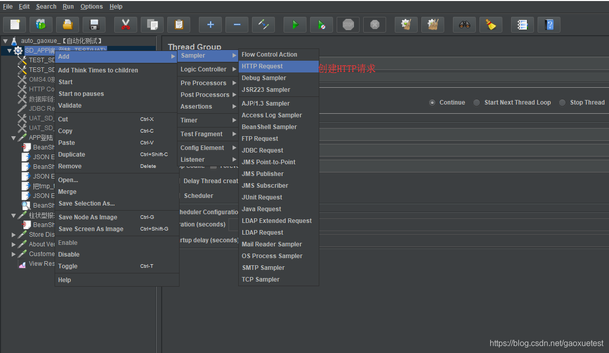 5.创建HTTP Request:右击【Thread Group(线程组)】选择【Add】—【Sampler(取样器)】—【HTTP Request】