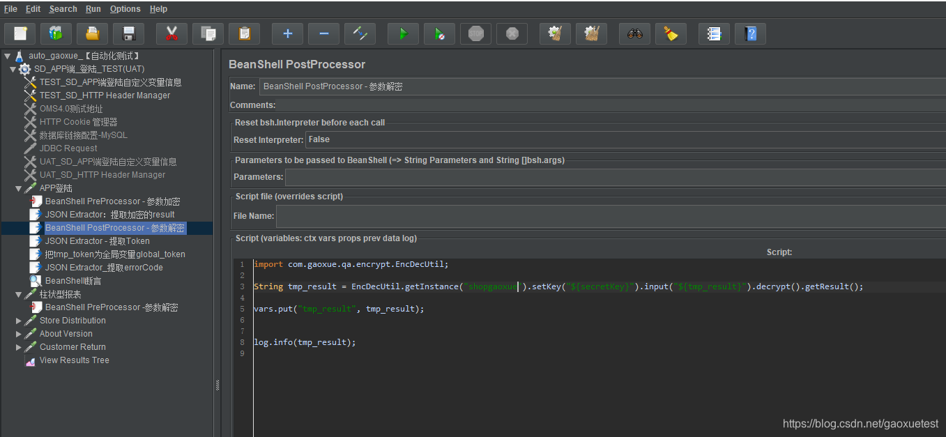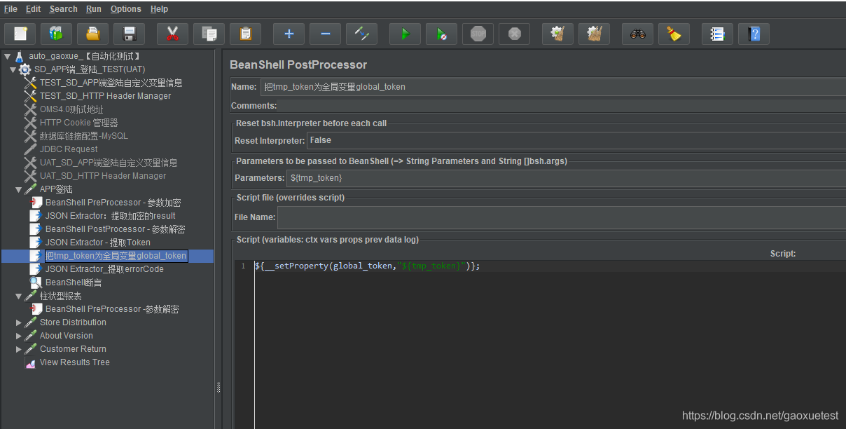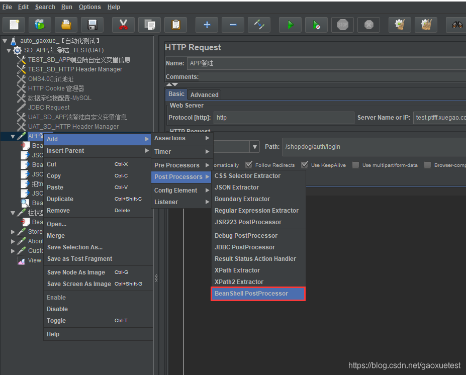 (3)添加Bean Shell PostProcessor:选择右击【httprequest】—【add】—【Post Processors】后置处理器—【Bean Shell PostProcessor】