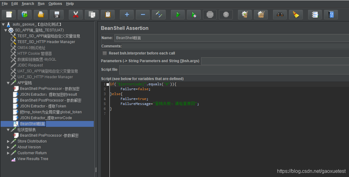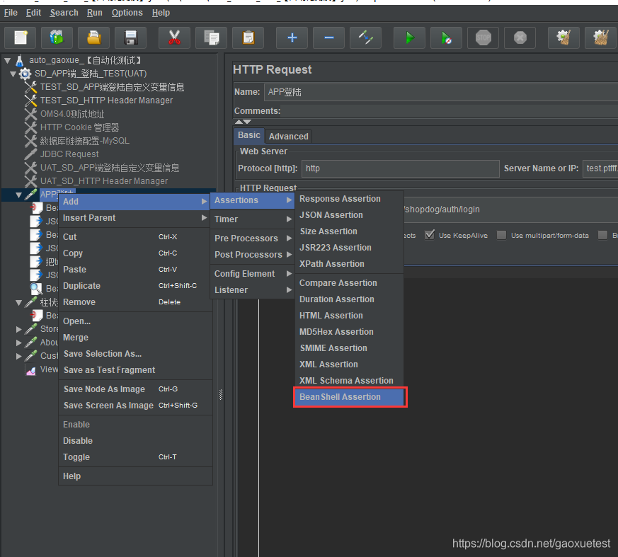 (7)添加BeanShell Assertion(beanshell断言):右击【httprequest】选择【Add】—【Assertions(断言)】—【BeanShell Assertion】