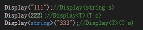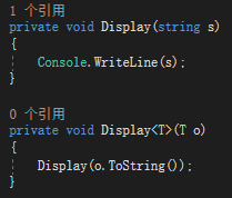 在第一个调用中,编译器可调用一个接受string参数的Display方法,也可调用泛型Display<T>(T o)(方法将T替换成string)。但是C#编译器的策略是先考虑较明确的匹配,再考虑泛型匹配。所以,它会生成对非泛型Display方法的调用。
