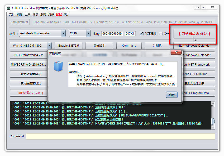 3、点击“开始卸载&修复”按钮,等他提示卸载结束的对话框